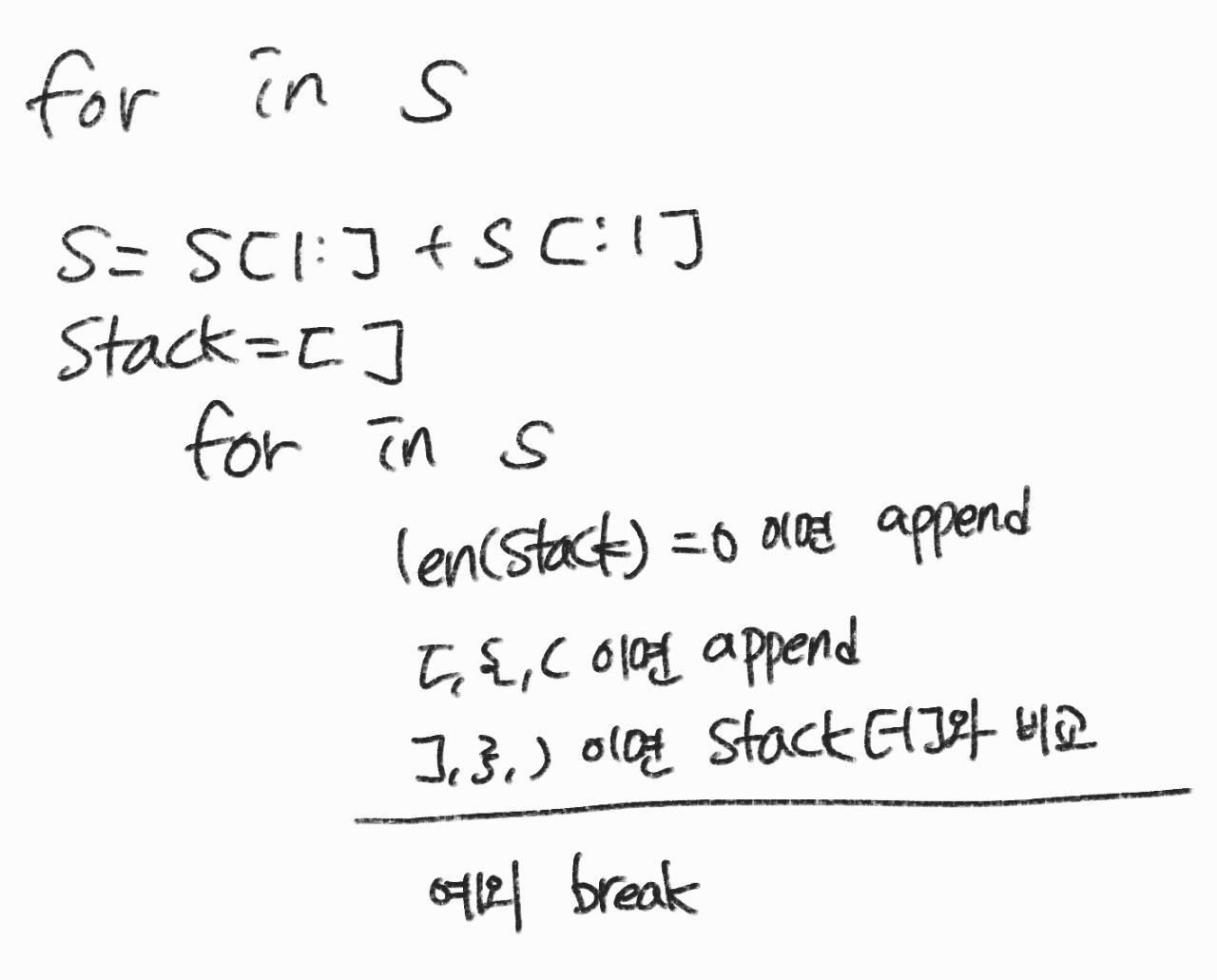 - 나머지 상황은 괄호쌍이 맞지 않는 상황이니 break로 for문을 멈춤