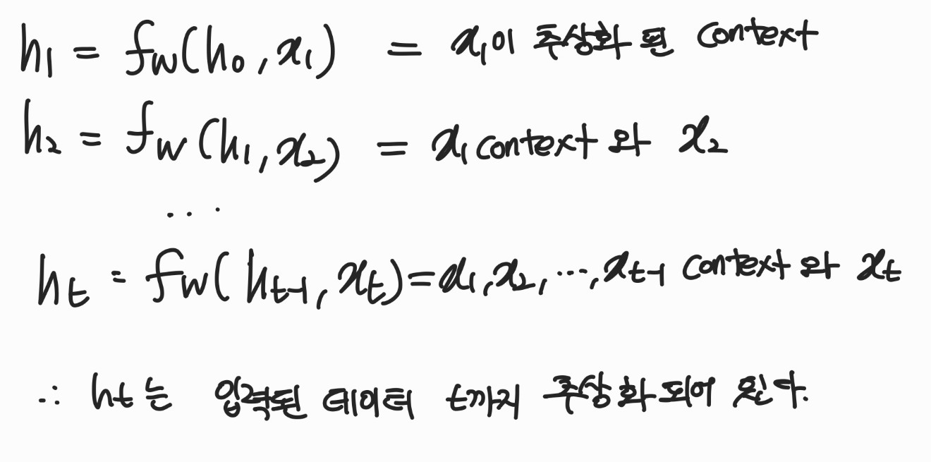 은닉 상태는 지금까지 입력된 모든 데이터가 추상화되어 있다는 것을 알 수 있다. 이를 점화식으로 나타내면 아래의 식과 같다.