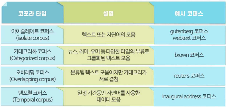 - 코퍼스는 말뭉치로 자연언어 연구를 위해 특정한 목적을 가지고 언어의 표본을 추출한 집합이다.