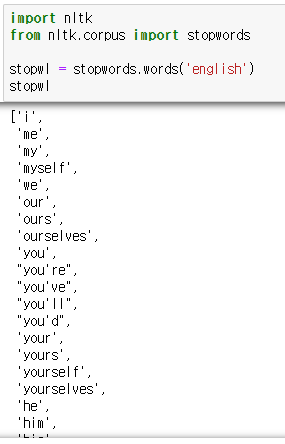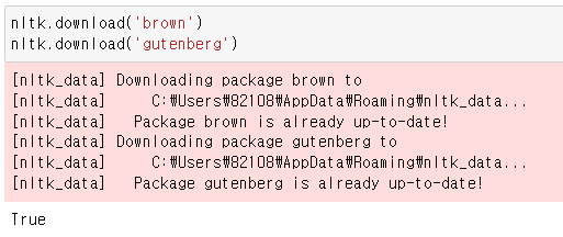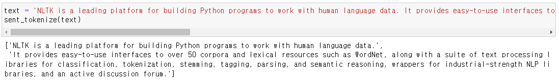 - NLTK(Natural Language Toolkit)는 python으로 작성된 영어 자연어 처리를 위한 라이브러리 및 프로그램 모음