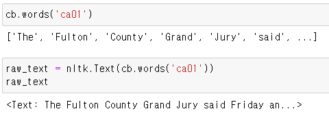특정 코퍼스(문서) 가져오기, Text 클래스는 문서 분석에 유용한 메소드를 가지고 있음