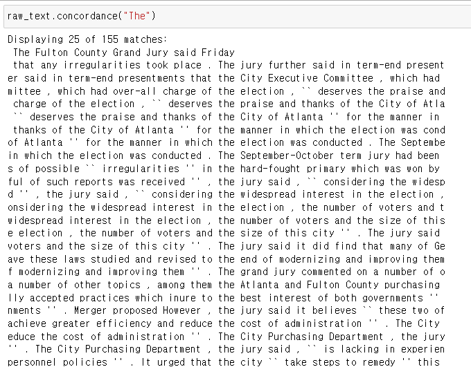 특정 단어가 들어간 문장 추출, Text 클래스 메소드로 Text로 생성해야지만 쓸 수 있음
