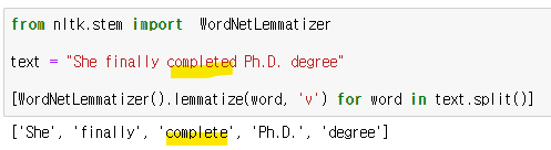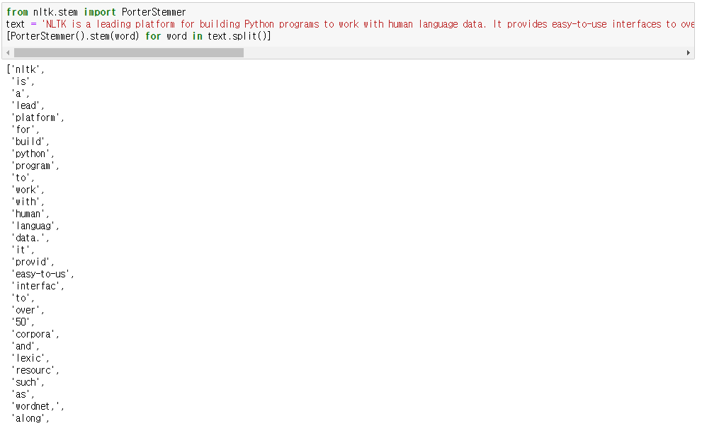 - 어간 추출로 접미사를 삭제하거나 대체하여 문장의 각 단어를 어근 형태로 변환하는 과정
