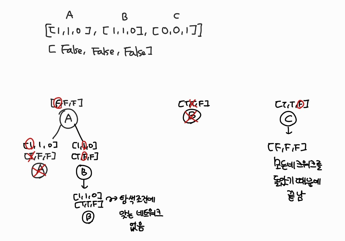 - 위의 네트워크 탐색 중 연결된 네트워크가 다른 연결을 가지고 있으면 해당 인덱스의 네트워크도 탐색함