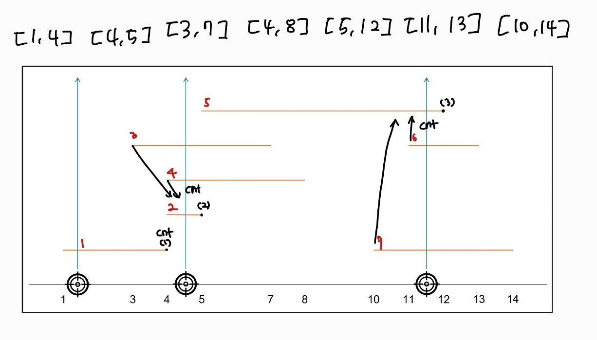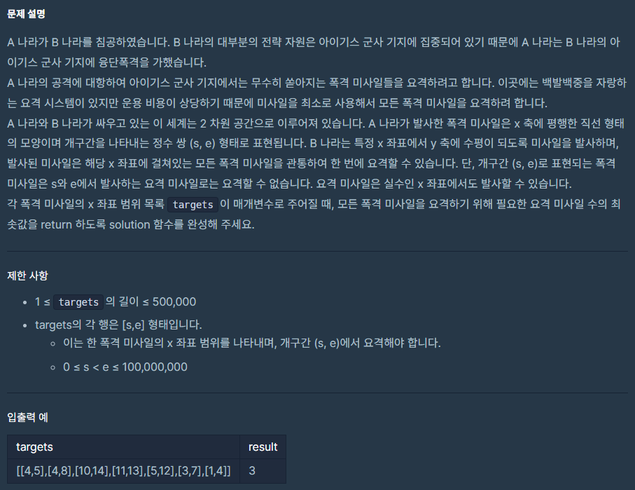 - targets를 폭격 개구간 e 기준으로 sort 하여 순서대로 미사일이 겹쳐있는 집합을 찾아 카운트함