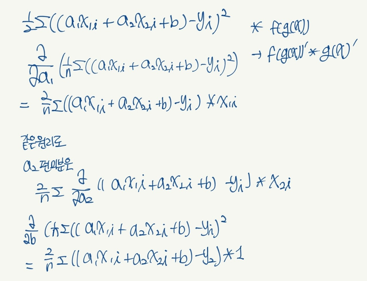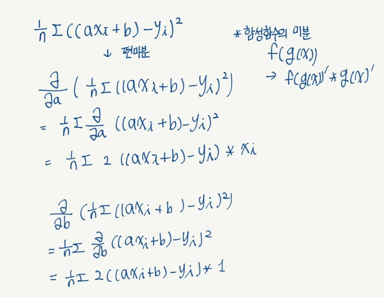 임의의 a값을 설정하고 미분값이 0이 나올 때까지 계속 a값을 재설정한다. 이는 b도 같은 과정을 거친다.