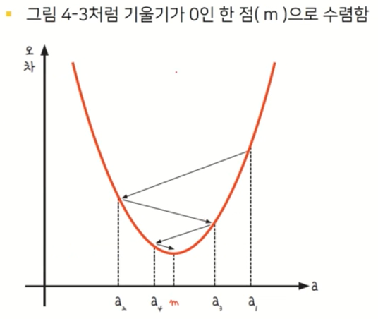 기울기가 0인 값을 m이라고 하였을 때m을 구하려면 임의의 한 점을 찍고 이 점을 m에 가까운 쪽으로 점점 이동시키는 과정이 필요하다. 이것이 가능하게 하는 게 경사 하강법이다. 이때 미분 기울기를 이용한다.